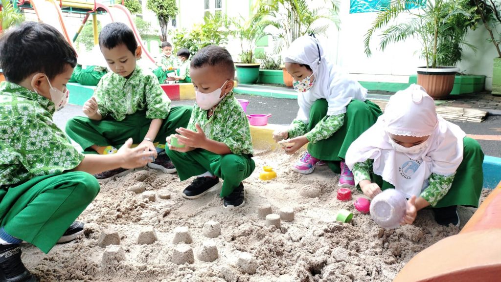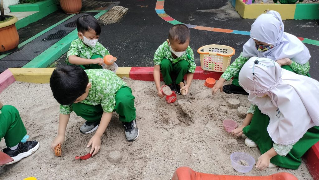 Tidak perlu jauh-jauh pergi ke pantai hari ini kelompok A3 bermain pasir di halaman sekolah seru dan sangat menyenangkan. Ditemani oleh ibu Amel anak-anak A3 bersama-sama membuat bentuk dari pasir. Ada yang bembuat rumah, istana, bentuk kuedan sebagainya. Kegiatan ini dilakukan untuk mengembangkan motorik pada anak. Tentu saja setelah bermain anak-anak tidak lupa untuk mencuci tangan. semangat anak sholeh dan sholeha.