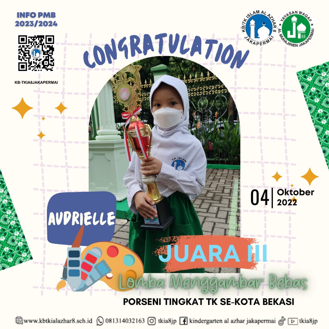 Alhamdulillah.. Audrielle dari kelas B2 mendapatkan Juara III Lomba Menggambar Bebas dalam acara PORSENI tingkat TK se-kota Bekasi. kegiatan yang dilaksanakan oleh Dikdik Kota Bekasi bertempat di Mega Bekasi tepatnya hari Rabu tanggal 04 Oktober 2022. KB-TK Islam Al Azhar mengirimkan 9 anak. Semoga juara yang diperoleh menambah semangat anak-anak belajar di sekolah.
